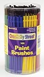 Canister of paint brushes includes 24 each of sizes 1 through 6. Each paint brush features a brightly color plastic handle and nylon bristles. Ideal for ages 3 and up. Canister is made of clear plastic and includes a clear plastic lid..